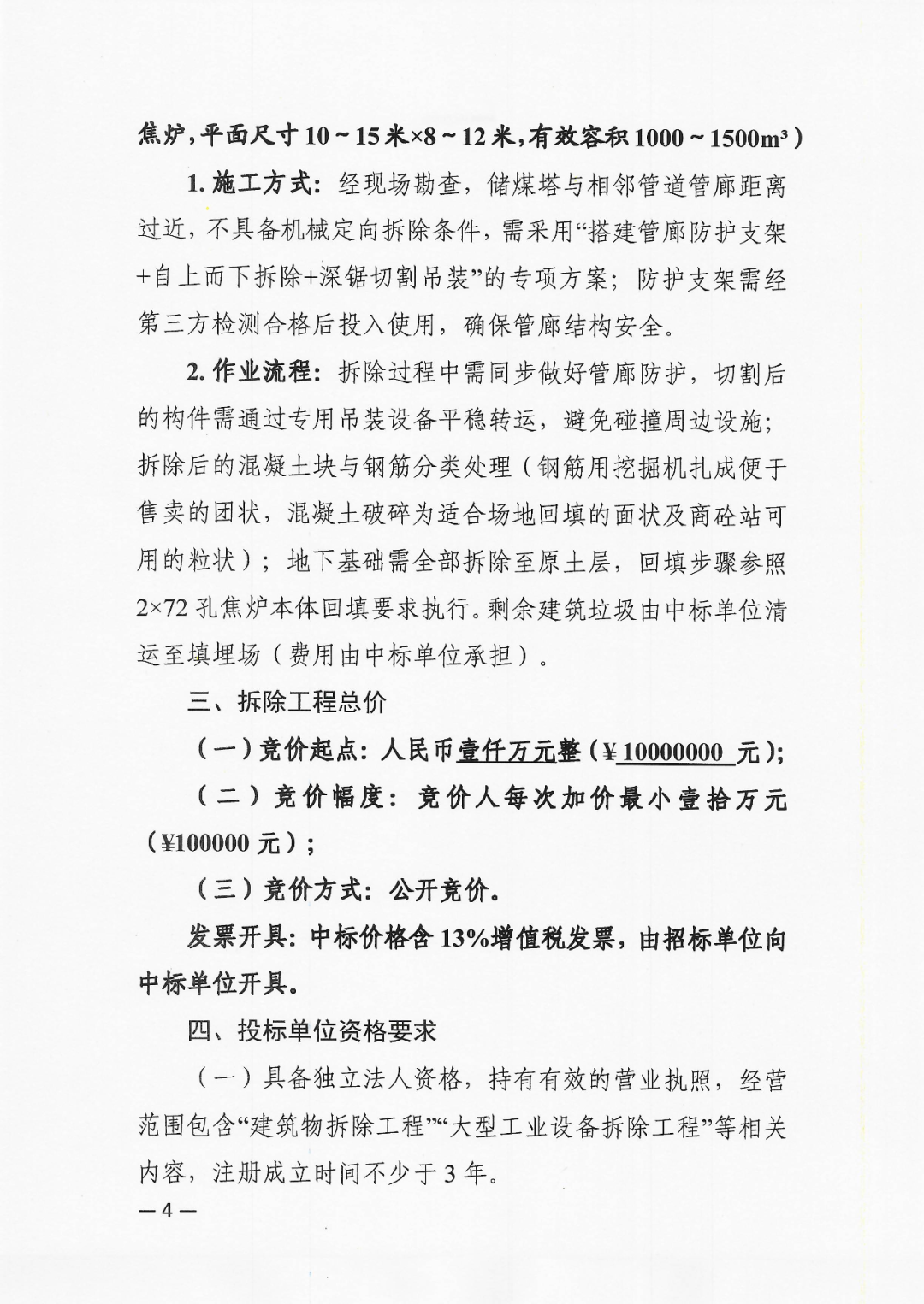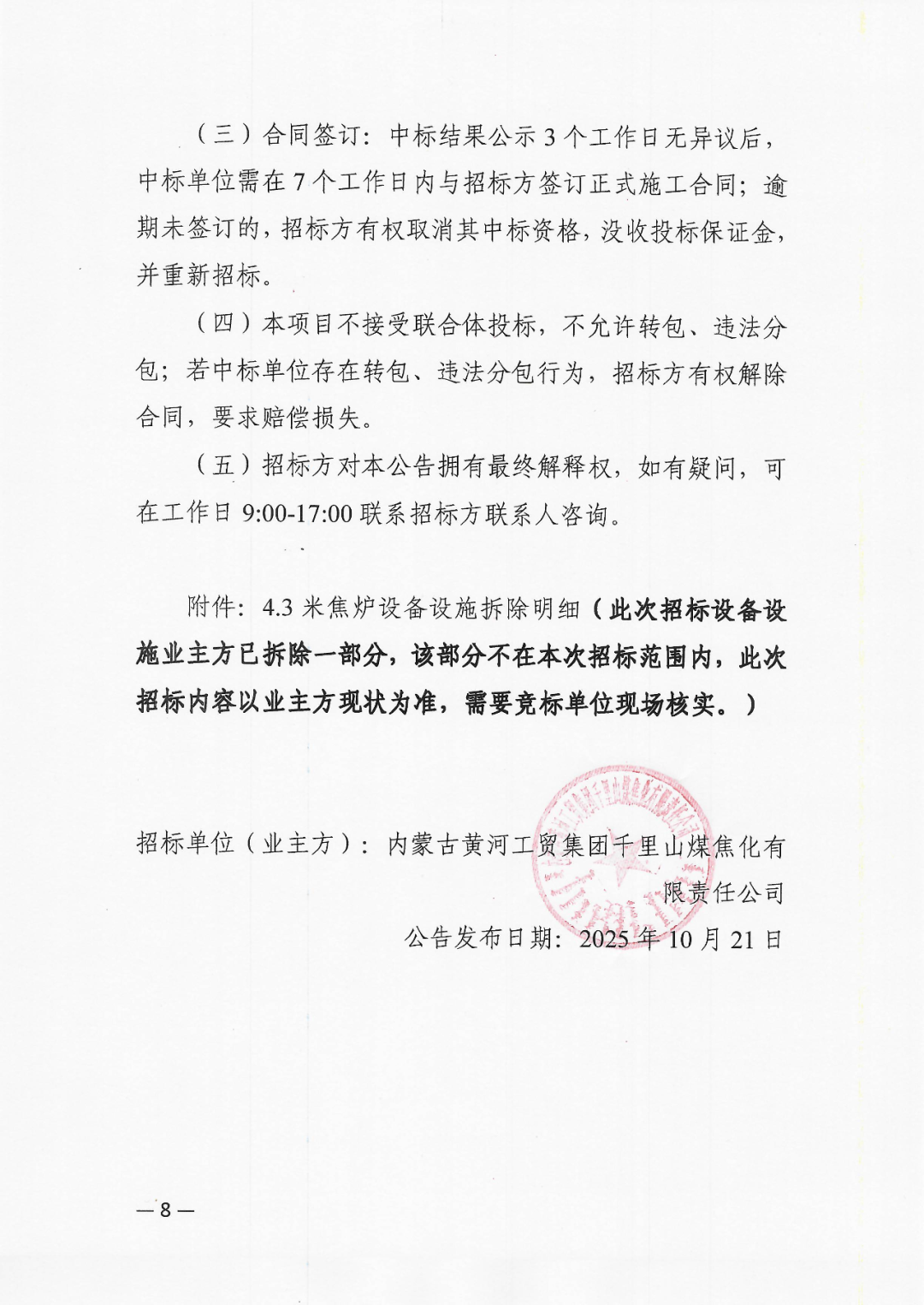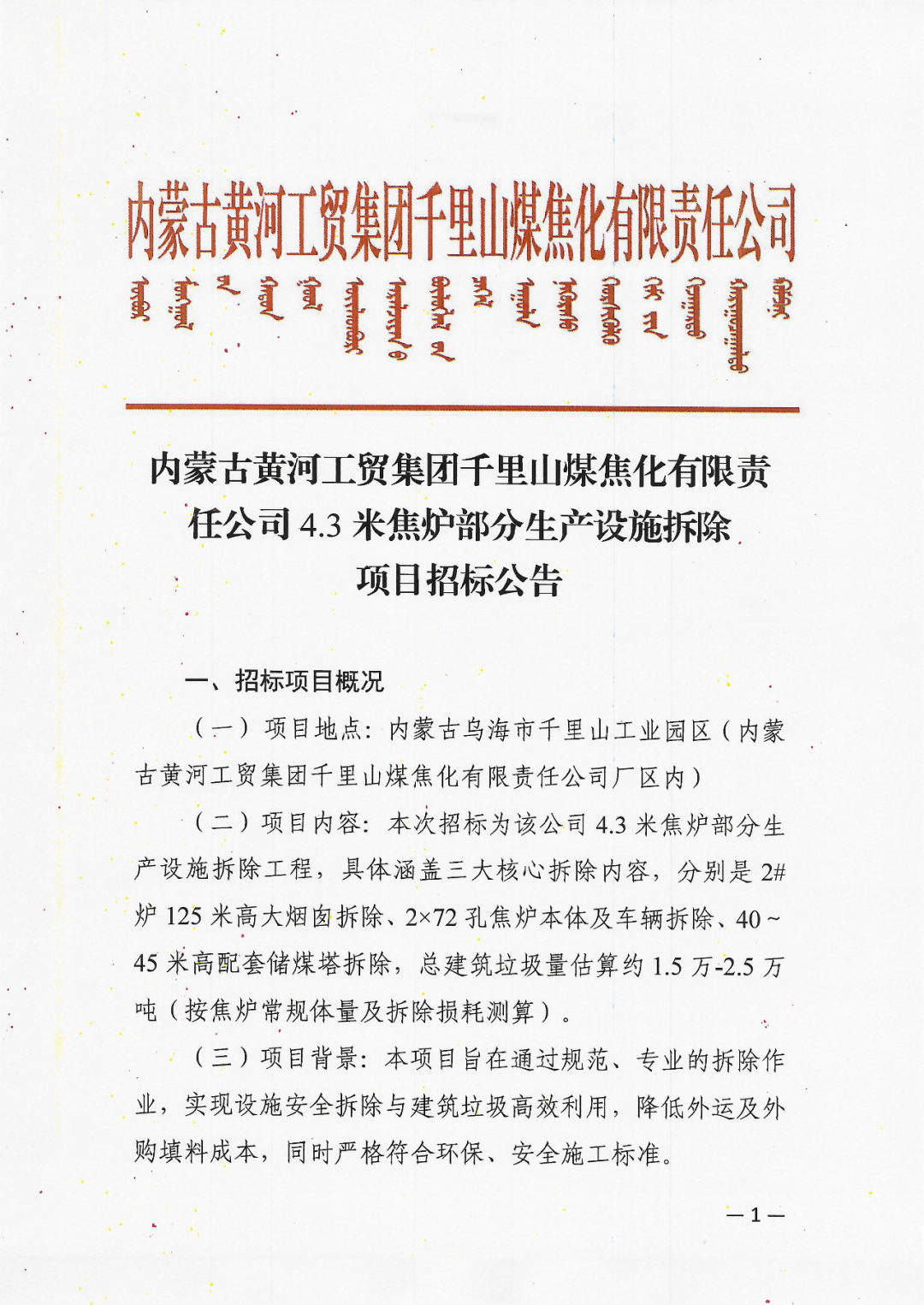內蒙古黃河工貿集團千里山煤焦化有限責任公司4.3米焦爐部分生產設施拆除項目招標公告