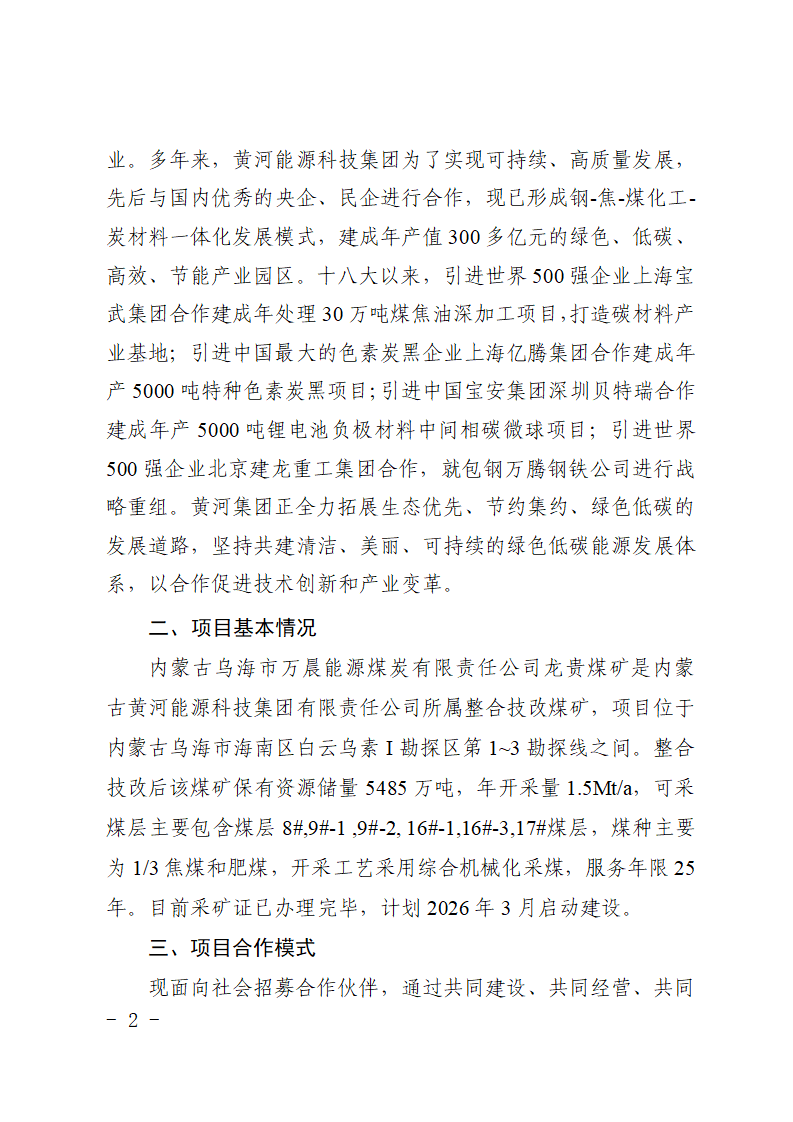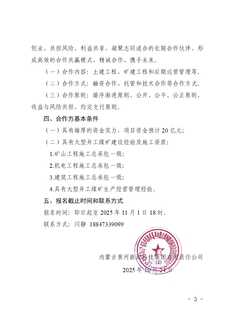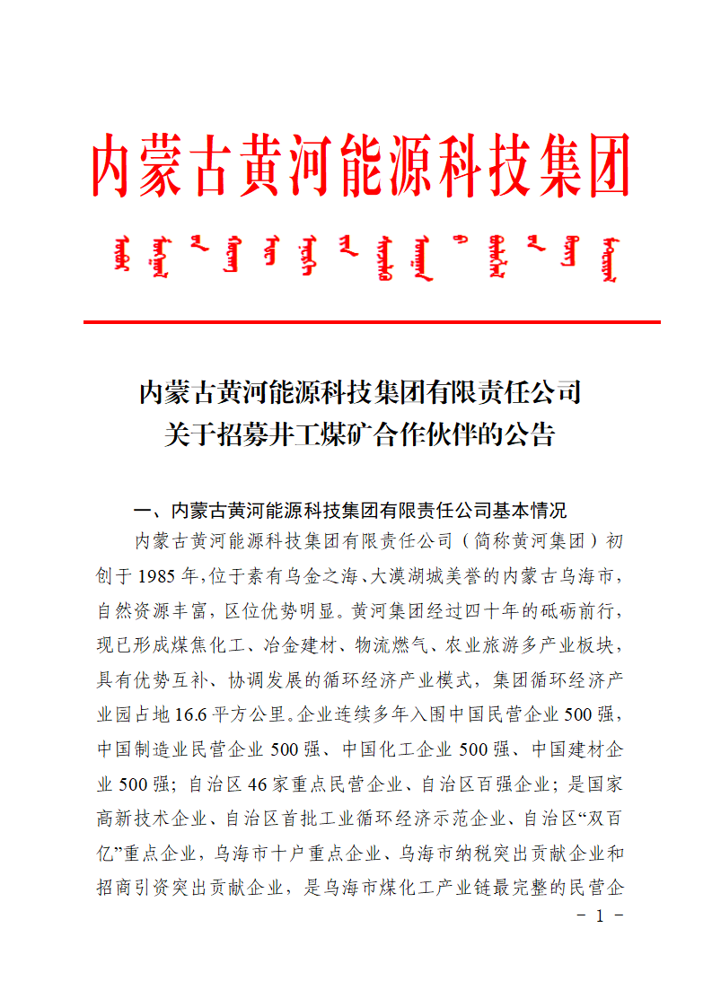 內蒙古黃河能源科技集團有限責任公司關于招募井工煤礦合作伙伴的公告